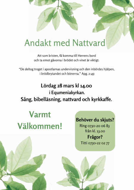 Detta evenemang har redan ägt rum. 28 mar 14:00 - 15:00 Andakt med Nattvard Sång, bibelläsning, nattvard och kyrkkaffe. Titti Larsson Lundvall Lägg till i kalender Google Kalender iCalendar Outlook 365 Outlook Live Dela